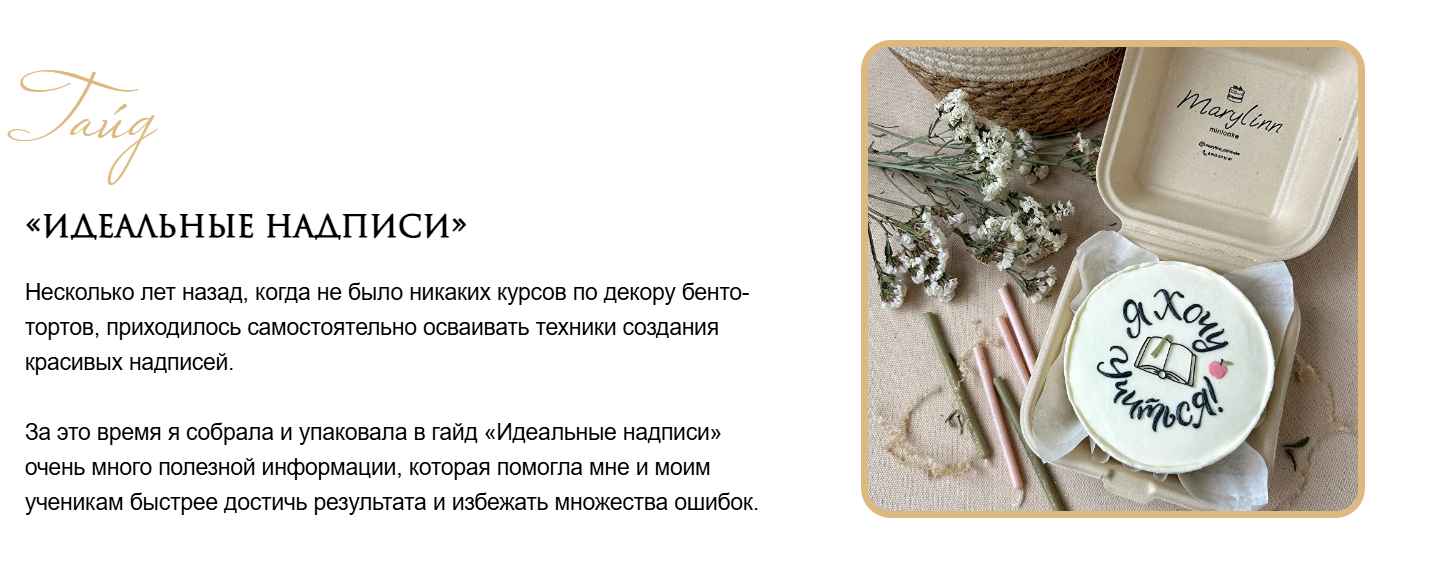 Гайд поможет найти ответы на многие вопросы и помочь кондитерам, особенно начинающим. Для тех, кто хочет достичь высокого уровня в кремовых надписях, советую также обратить внимание на «Большой курс по надписям» в формате подробных видео-уроков.