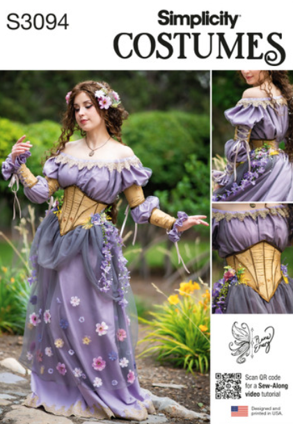 Выкройка платья-пуловера в стиле фэнтези с боковыми клиньями и эластичной кулиской на вырезе горловины имеет длинные пышные рукава с эластичными манжетами, образующими оборки, прозрачную накладку, кружевную отделку и покупные цветы, заключенные между двумя слоями верхней юбки.